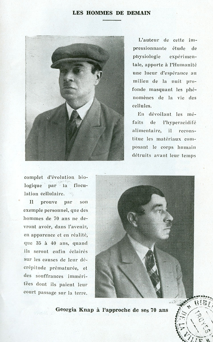 • Arrivé à la quarantaine, notre Troyen s’installe en région parisienne et se lance dans la plus rude des batailles : épouvanté par les outrages du temps sur sa personne, il entreprend de rajeunir ! Une nouvelle fois précurseur, il promeut la prévention par une hygiène de vie irréprochable, met au point une méthode qui évoque fortement l’acupuncture et fonde une clinique dite « Consortium Médical Végétarien » qui rencontre le succès entre 1930 et 1945. Knap n’oublie pas de donner rendez-vous régulièrement aux journalistes afin de leur faire la démonstration de ses progrès personnels en introduisant immanquablement son propos par la formule : « Quand j’étais vieux… » !