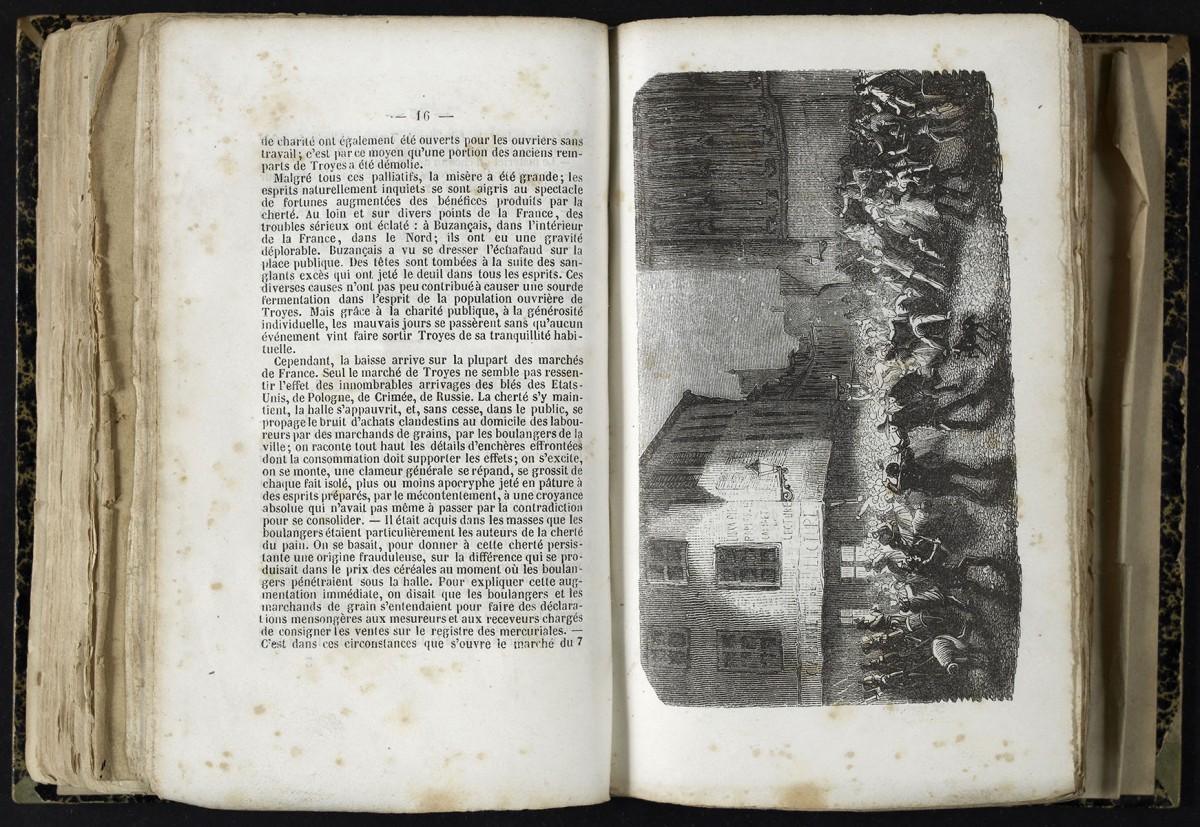 En 1853, notre almanach revient à sa présentation, plus économique, de 1851. Un article substantiel au titre lapidaire – Le 2 décembre à Troyes – laisse apparaître un Aufauvre prudent. Gadan vient d’être déporté en Algérie, la police et la censure sont omniprésentes. Il écrit en introduction de son article :  » … La nature de notre publication nous interdit toute espèce d’appréciation… Ceux qui viendront plus tard rattacheront, s’il leur plaît, cette chronique locale à l’ensemble du mouvement de Décembre ». Les résultats du vote des électeurs de l’Aube sur le plébiscite et l’établissement du Second Empire sont rejetés en fin de volume. Bien illustrés de lithographies, des biographies, des articles sur les anciennes portes de Troyes, les Clubs de Troyes en 1792, Voltaire à Romilly en 1791 et autres composent un petit ouvrage passionnant ou le récit comique d’une escroquerie banale sert de bouquet final.