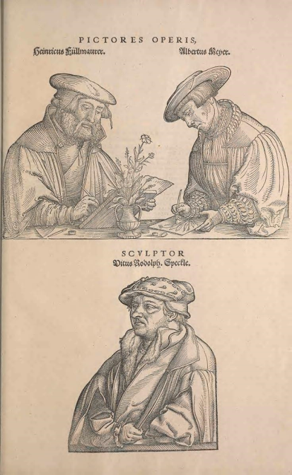L’importance donnée à l’illustration est soulignée par la présence exceptionnelle des portraits des trois artistes dans l’ouvrage. Il s’agit d’Albrecht Meyer, le dessinateur, représenté en train de peindre une plante d’après nature, de Heinrich Füllmaurer, chargé de transposer les dessins sur bois, et enfin de Veit Rudolf Speckle, le graveur, en train de tailler les bois.