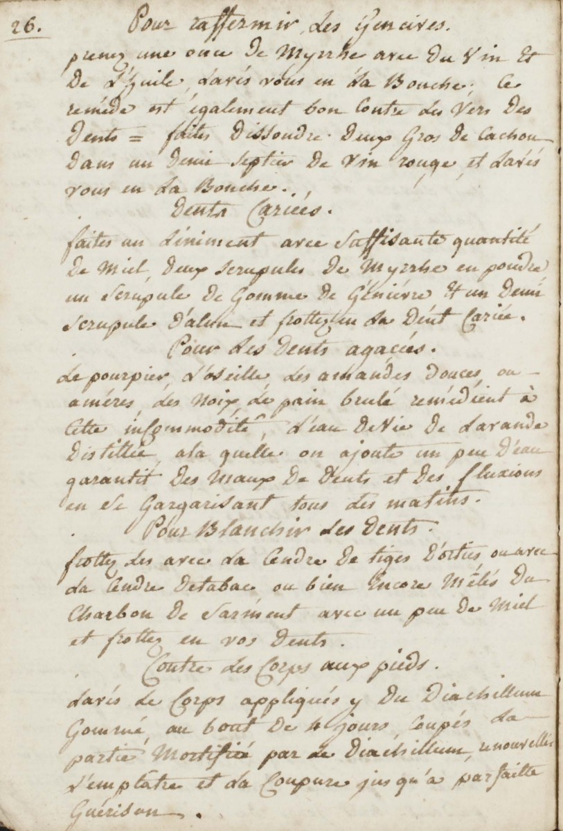 Les carnets de notes du prêtre sont remplis de ces potions et mélanges supposés guérir de toutes les maladies et des douleurs les plus fréquentes. Pour les maux de dents, le curé préconise ainsi des bains de bouche à la myrrhe, au vin et à l’huile pour « raffermir les gencives » ou une mixture pour réparer les caries. Les dents peuvent également d’après lui être blanchies en les frottant avec une tige d’ortie ou de la cendre de tabac !
