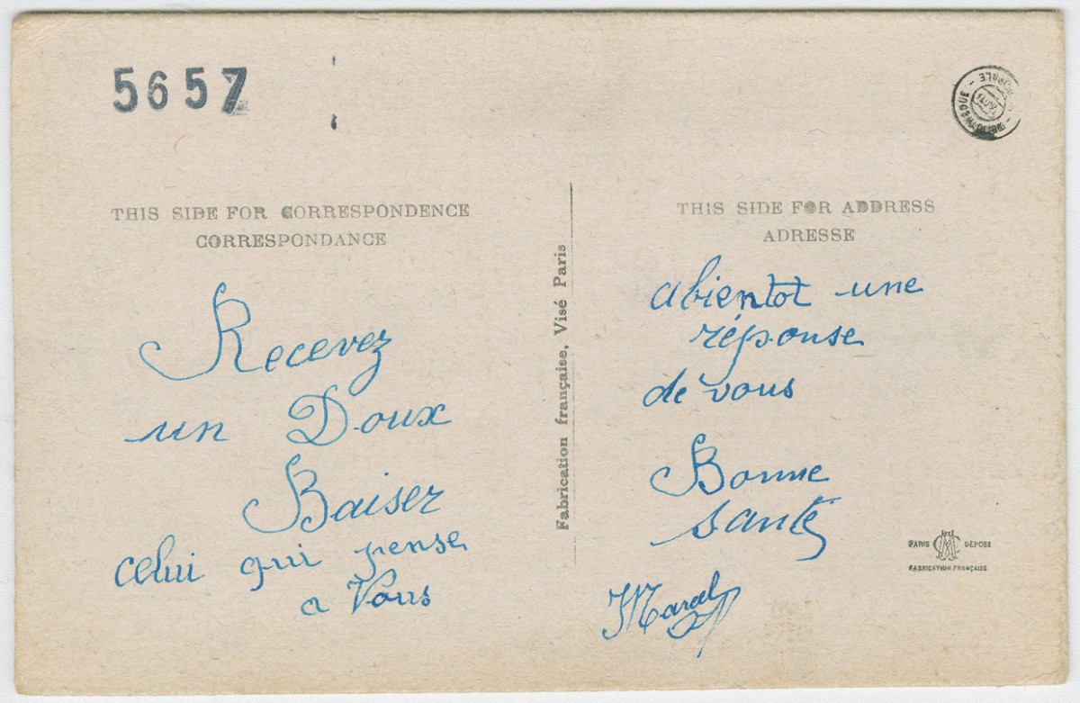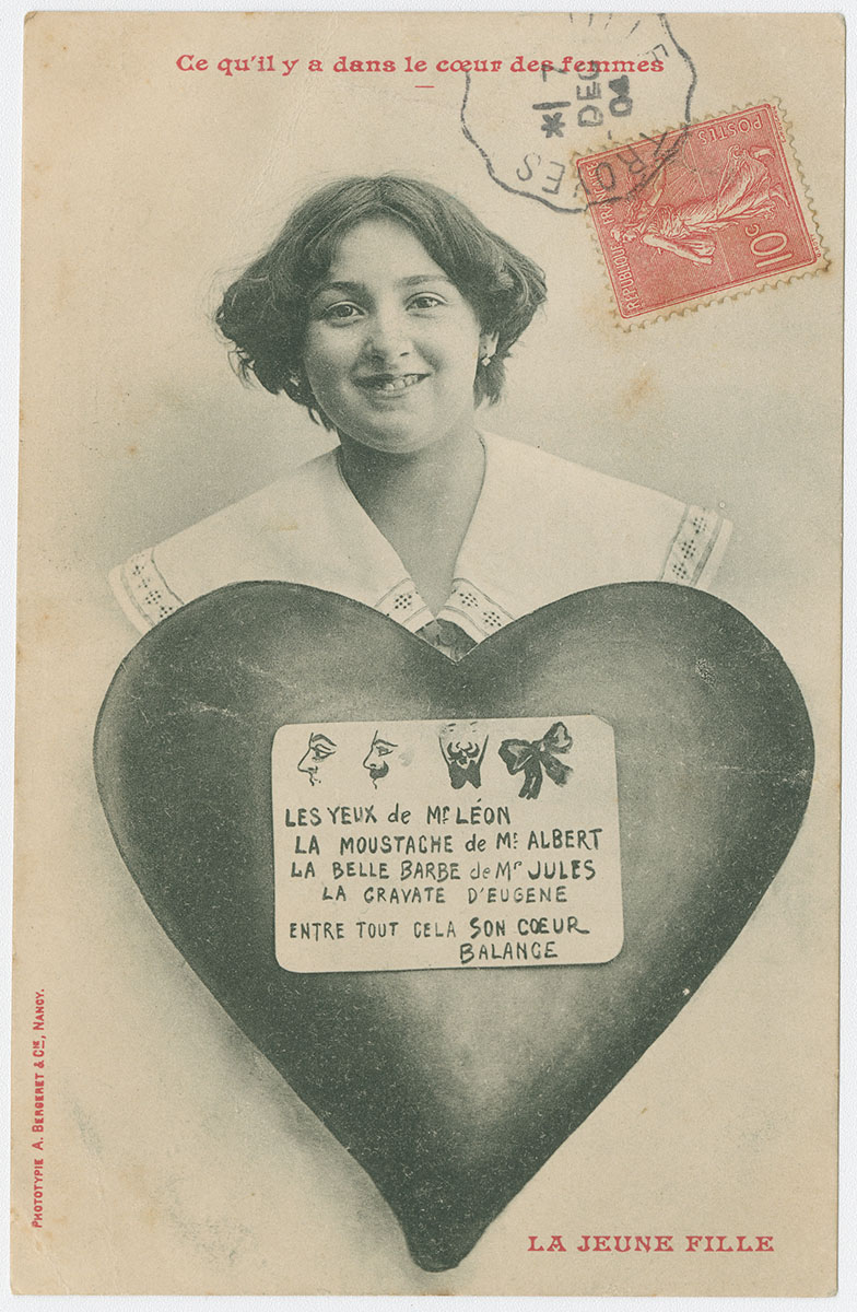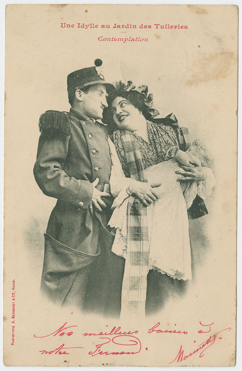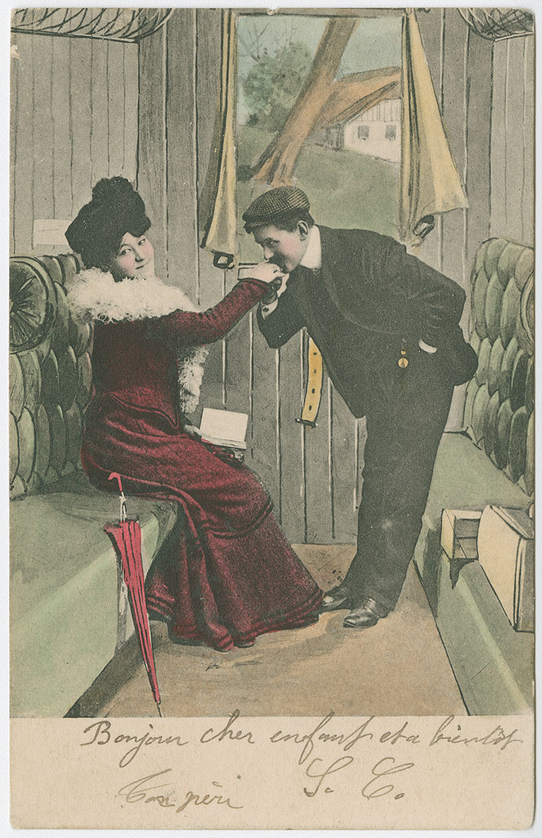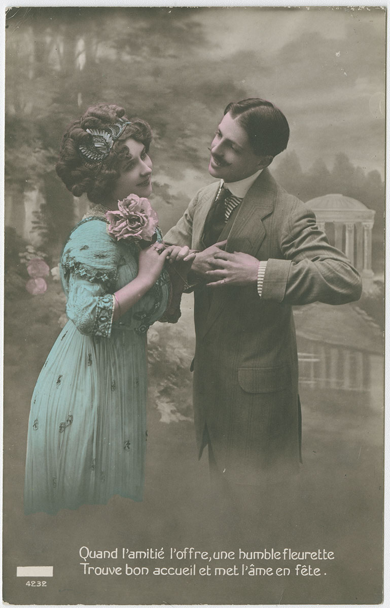 A partir de 1904, il devient possible d’ajouter quelques mots au verso, dans l’espace restreint d’un petit rectangle de papier. Aux timides comme aux audacieux, la carte postale permet d’avouer ses sentiments. Entre maladresse et touchante sincérité se déploie alors le jeu de la séduction. On y parle d’attente, d’espoir, parfois de déception, on se fixe rendez-vous. On évoque « l’amitié », ce sentiment durable qui doit lier pour la vie les deux amoureux…