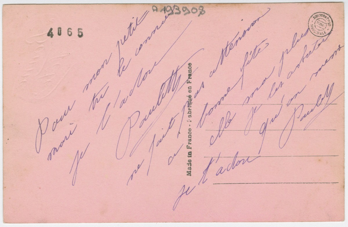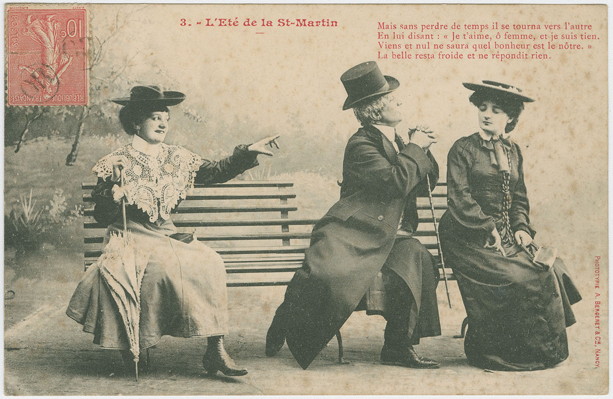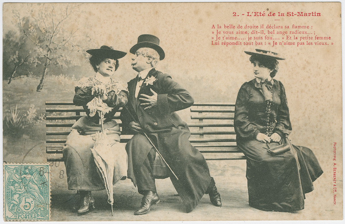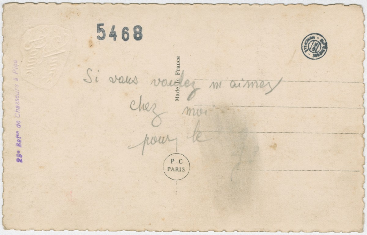 A partir de 1904, il devient possible d’ajouter quelques mots au verso, dans l’espace restreint d’un petit rectangle de papier. Aux timides comme aux audacieux, la carte postale permet d’avouer ses sentiments. Entre maladresse et touchante sincérité se déploie alors le jeu de la séduction. On y parle d’attente, d’espoir, parfois de déception, on se fixe rendez-vous. On évoque « l’amitié », ce sentiment durable qui doit lier pour la vie les deux amoureux…