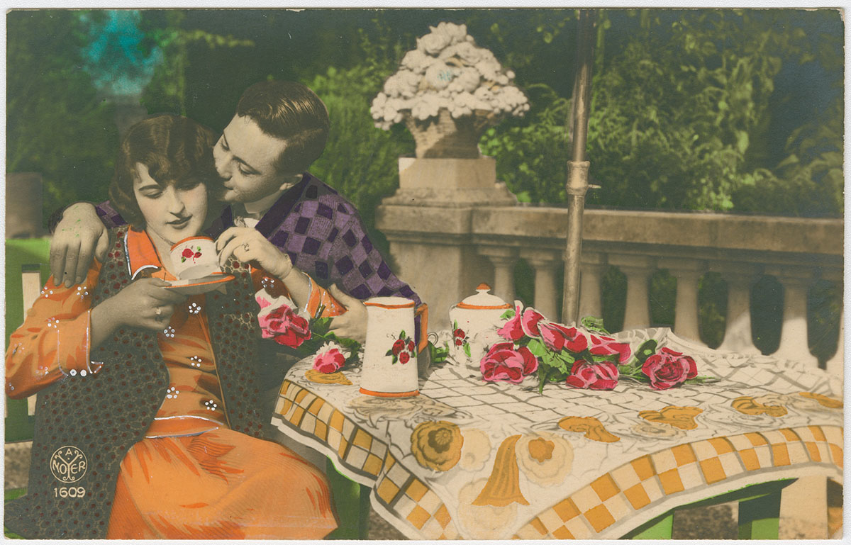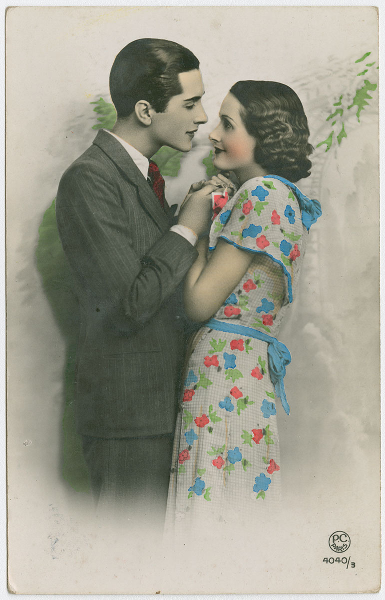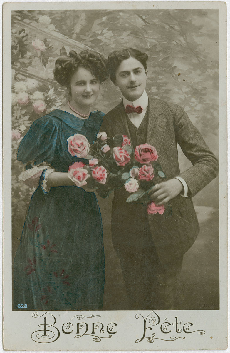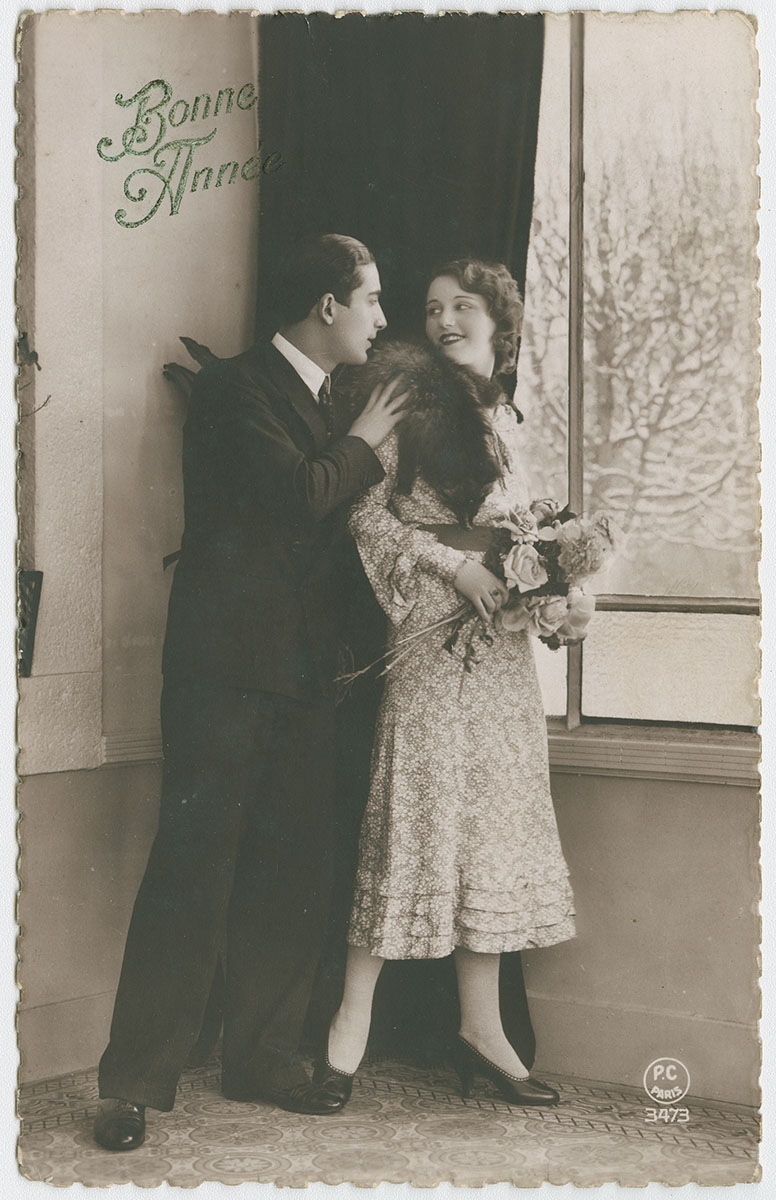 Messagères d’un genre nouveau, les cartes fantaisie font leur apparition, et avec elles le métier d’artiste photographe. Réalisées en studio, le plus souvent avec des comédiens professionnels et dans des décors bucoliques, ces cartes mettent en scène des couples stéréotypés qui se font le reflet de leur époque et des conventions qui régissent les relations entre hommes et femmes. Au fil des décennies, la gestuelle évolue avec les mœurs : le baiser est d’abord rare, toujours pudique et innocent, puis les mains enlacées s’accompagnent progressivement d’étreintes plus étroites. Les amoureux apparaissent symboliquement séparés par une coupure visuelle à l’époque de la première guerre mondiale, puis le cadrage se resserre sur les visages dans les années 20.
