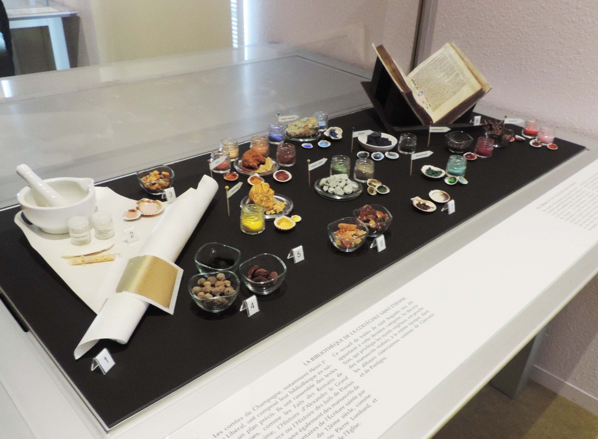 En 2018, 8 classes soit environ 200 enfants, ont été très intéressés de toucher du parchemin, d’imaginer que pour réaliser la Grande Bible de Clairvaux, plusieurs centaines de peaux étaient nécessaires ! Sans parler des encres qu’il fallait fabriquer au préalable, avec des pierres de malachite (qui donnent la couleur verte), de lapis lazuli (pour le bleu) : de nos jours on s’en sert pour faire des colliers ! Ils sont encore plus étonnés quand on leur parle des petits insectes qu’on faisait sécher pour donner le rouge cochenille, qu’on utilise toujours d’ailleurs pour leurs fraises Tagada ! Grâce au matériel prêté par la Médiathèque et à la toute nouvelle vitrine pédagogique installée dans l’exposition, ils peuvent vraiment appréhender le travail minutieux du moine copiste, de l’enlumineur, du relieur. Inimaginable pour eux qu’un tel manuscrit ait quasiment la valeur d’une maison actuelle….