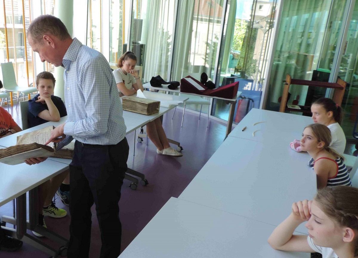 En parallèle à l’apprentissage d’un instrument, les jeunes élèves du Conservatoire Marcel Landowsky suivent des cours de formation musicale. Le dernier cours de l’année de la classe d’Elsa Nectoux était une occasion pour les élèves et leurs parents de découvrir les manuscrits et livres musicaux anciens conservés à la Médiathèque. Du 12e au 18e siècle, sept ouvrages et partitions choisis leur ont permis de mieux connaître l’évolution de l’écriture musicale.