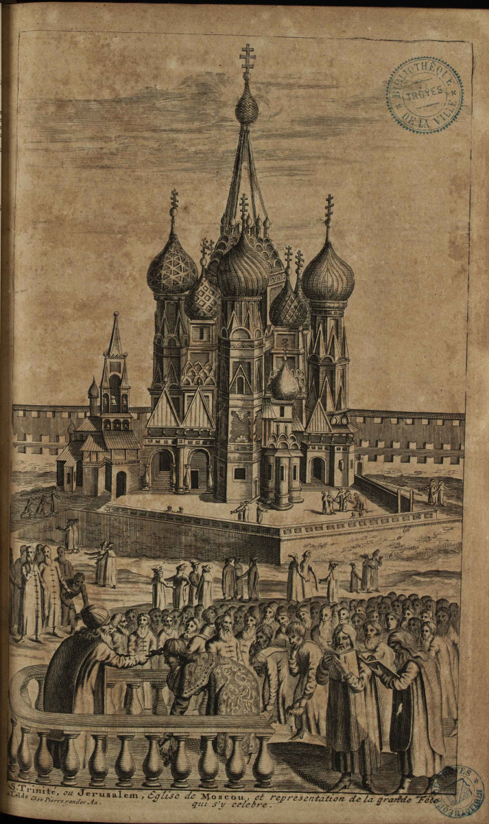 Commençons avec Adam Olearius, qui visite Moscou en 1634. Frédéric III, duc de Holstein, envoie une ambassade auprès du tsar afin de négocier un arrangement autour du commerce des soies. En tant que secrétaire, Adam Olearius fait partie de la délégation et livre un récit détaillé, jour par jour, de son voyage. L’ouvrage est un succès qui connaît nombre de rééditions et est traduit en français par Abraham de Wicquefort. L’exemplaire possédé par la médiathèque Jacques-Chirac date de 1727.