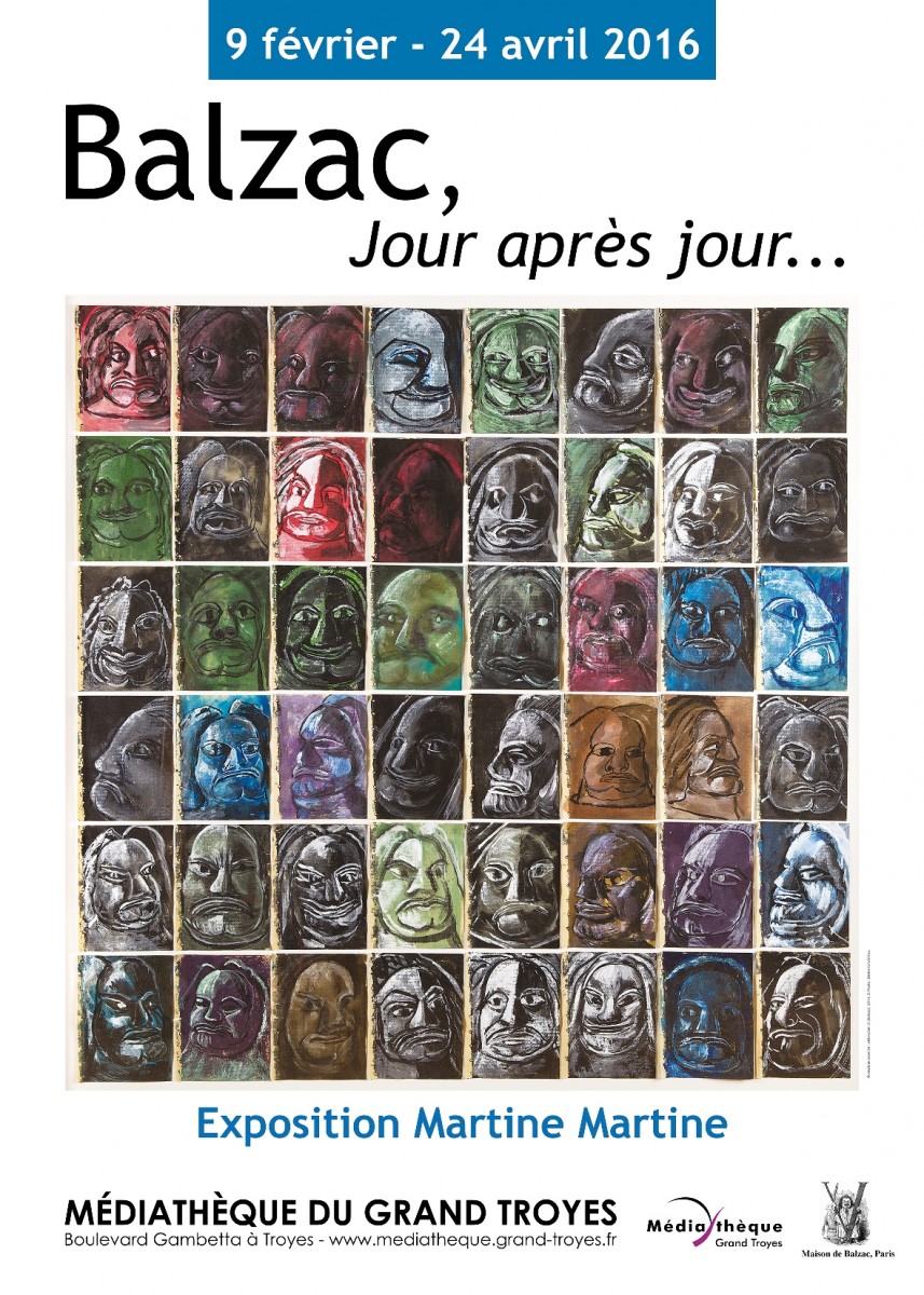 L’exposition « Balzac, Jour après jour…, par Martine Martine » est une création inédite de la Médiathèque du Grand Troyes. En parallèle la Galerie Nicolas Deman, 12 rue Jacques Callot, Paris 6ème, présente du 4 février au 24 avril 2016, une exposition d’œuvres de Martine Martine, autour du portrait de Balzac intitulée : « L’altérité sombre ».