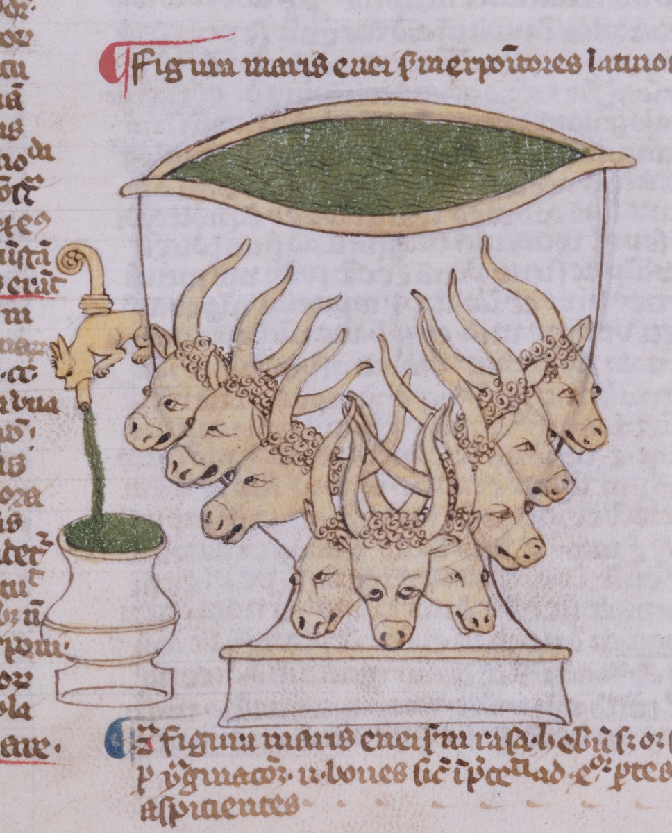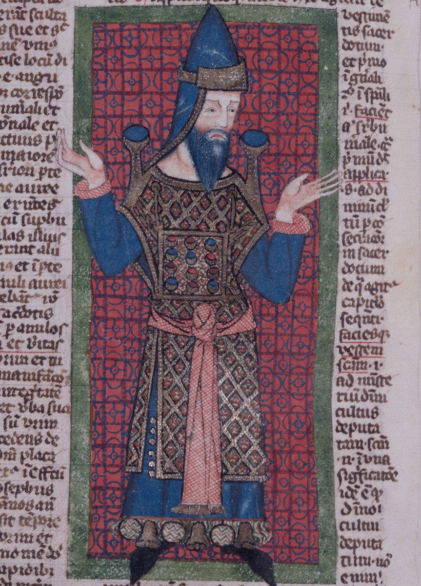 Le manuscrit des Postilles (Annotations) de Nicolas de Lyre, réalisé vers 1350, est quant à lui enluminé de nombreuses figures, dont certains motifs et couleurs, comme le vert, pourraient indiquer une réalisation dans un atelier normand. Dans l’exposition, le volume est ouvert sur la représentation d’Aaron, premier grand prêtre du Temple, dans les habits sacerdotaux décrits dans le livre de l’Exode : une tunique de lin, une robe de laine bleue, un tablier richement brodé, un pectoral orné de douze pierres précieuses, chacune gravée avec le nom de douze des tribus d’Israël, une couronne d’or sur laquelle étaient inscrits les mots « Consacré à l’Éternel ».