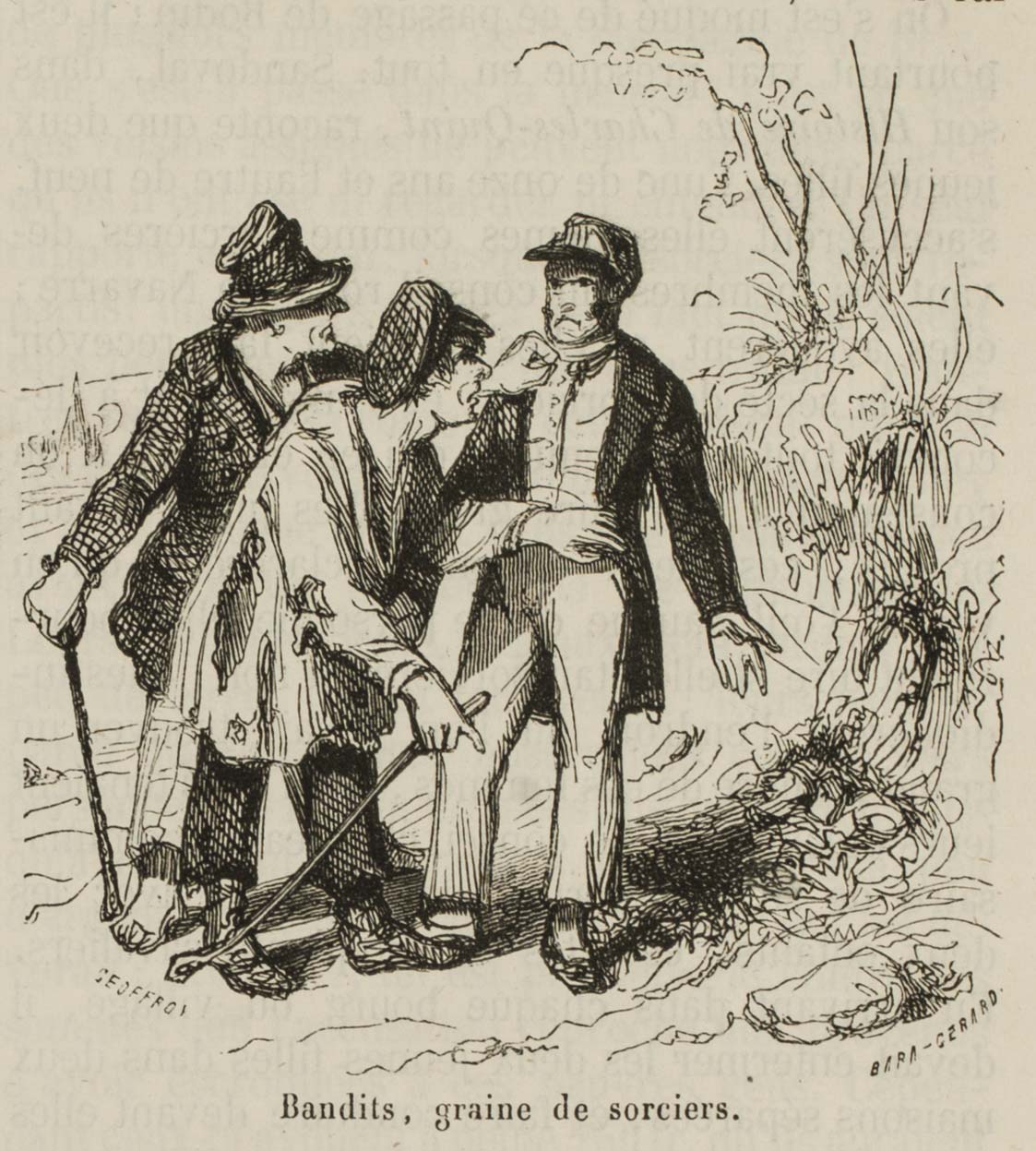 Merci de ces précisions sur le parcours spirituel un peu « chaotique » de Jacques Collin de Plancy. Son dictionnaire infernal est plein de gravures toutes plus effrayantes et saisissantes les unes que les autres, mais l’article « Sorcier » est étonnamment sobre. Une seule illustration qui fait le lien entre sorciers et anciens bandits, mais pas de scène de danse ou de maléfices. La gravure d’introduction au début du livre est en revanche très violente, nous avons même dû la recadrer pour ne pas montrer certains détails, notamment un banquet de cannibales !