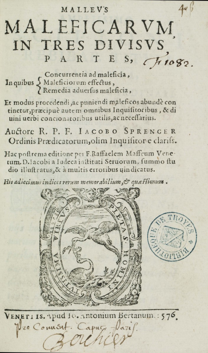 La traque des sorciers et sorcières, avec ses inquisiteurs et ses exorcismes, ne commence réellement qu’au 15e siècle. En 1484, le Pape Innocent VIII fulmine une bulle appelant à la prudence face aux méfaits des sorciers. Deux ans plus tard, deux moines allemands, Heinrich Kramer et Jacob Sprenger, publient à Strasbourg le Malleus maleficarum. Ce livre en latin est rapidement traduit en français sous le titre de Marteau des sorcières, « Marteau contre les sorcières » en français de l’époque.