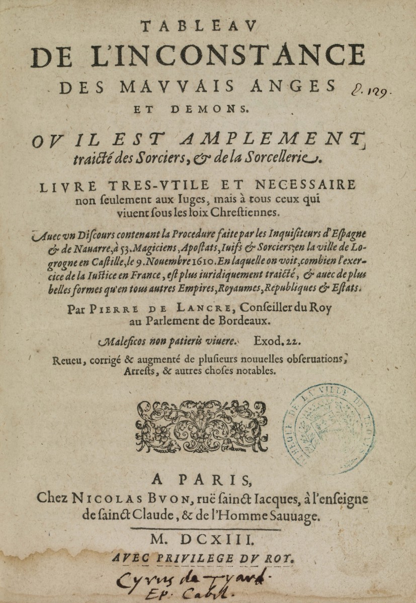 Ces théories sont largement reprises par Pierre de Lancre, conseiller au Parlement de Bordeaux, lors d’une chasse aux sorcières qu’il mène dans le Pays basque, « expérience » dont il tirera un livre conservé lui aussi à la Médiathèque de Troyes Champagne Métropole.