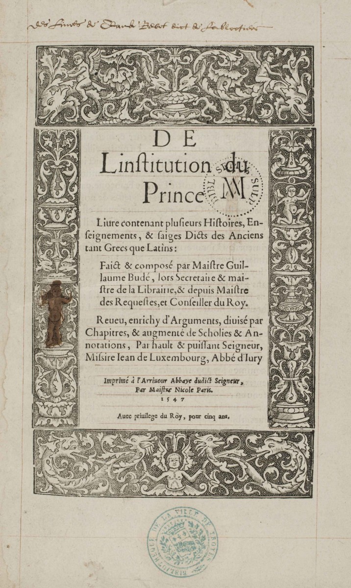 Nicole Paris est un personnage assez fascinant parce qu’il est atypique dans le monde de l’imprimerie d’une province française. Ce n’est pas du tout un imprimeur comme les autres qui produit les ouvrages habituels. Il a certes imprimé des livres religieux ou d’école, mais aussi d’autres plus surprenants, des ouvrages de Belles-lettres ou d’autres au contenu parfois étonnant. C’est enfin quelqu’un qui s’est étroitement associé à un grand personnage de la région, nommé Jean de Luxembourg [alors abbé de Larivour, abbaye-fille de Clairvaux]. Ensemble, ils vont produire l’un des ouvrages phares de l’époque, intitulé L’Institution du Prince rédigé par Guillaume Budé. Ce livre de théorie politique aura beaucoup d’influence : ce sont ces exemplaires imprimés par Nicole Paris qu’on retrouve ensuite auprès des rois d’Angleterre et de France. Dans leurs bibliothèques, ces personnages liront ainsi des mots imprimés ici, à Troyes.