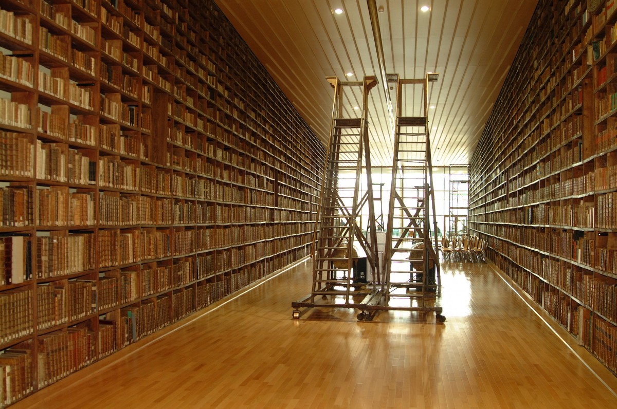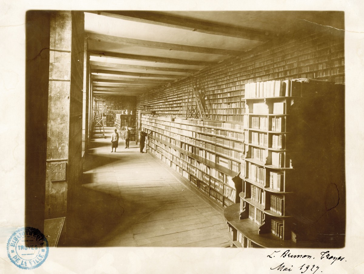 Les 17 hauteurs de rayonnages de bois, d’une longueur totale de 1,7 kilomètre, contiennent 48 500 livres imprimés datant des 16ème, 17ème et 18ème siècles. La plupart proviennent des bibliothèques des établissements ecclésiastiques de Troyes et de Champagne méridionale, dont les biens furent nationalisés au moment de la Révolution française. Les collections de livres furent rapidement regroupées dans la première Grande salle, qui était le dortoir des moines de l’abbaye Saint-Loup, dans l’objectif de créer une bibliothèque publique à Troyes.