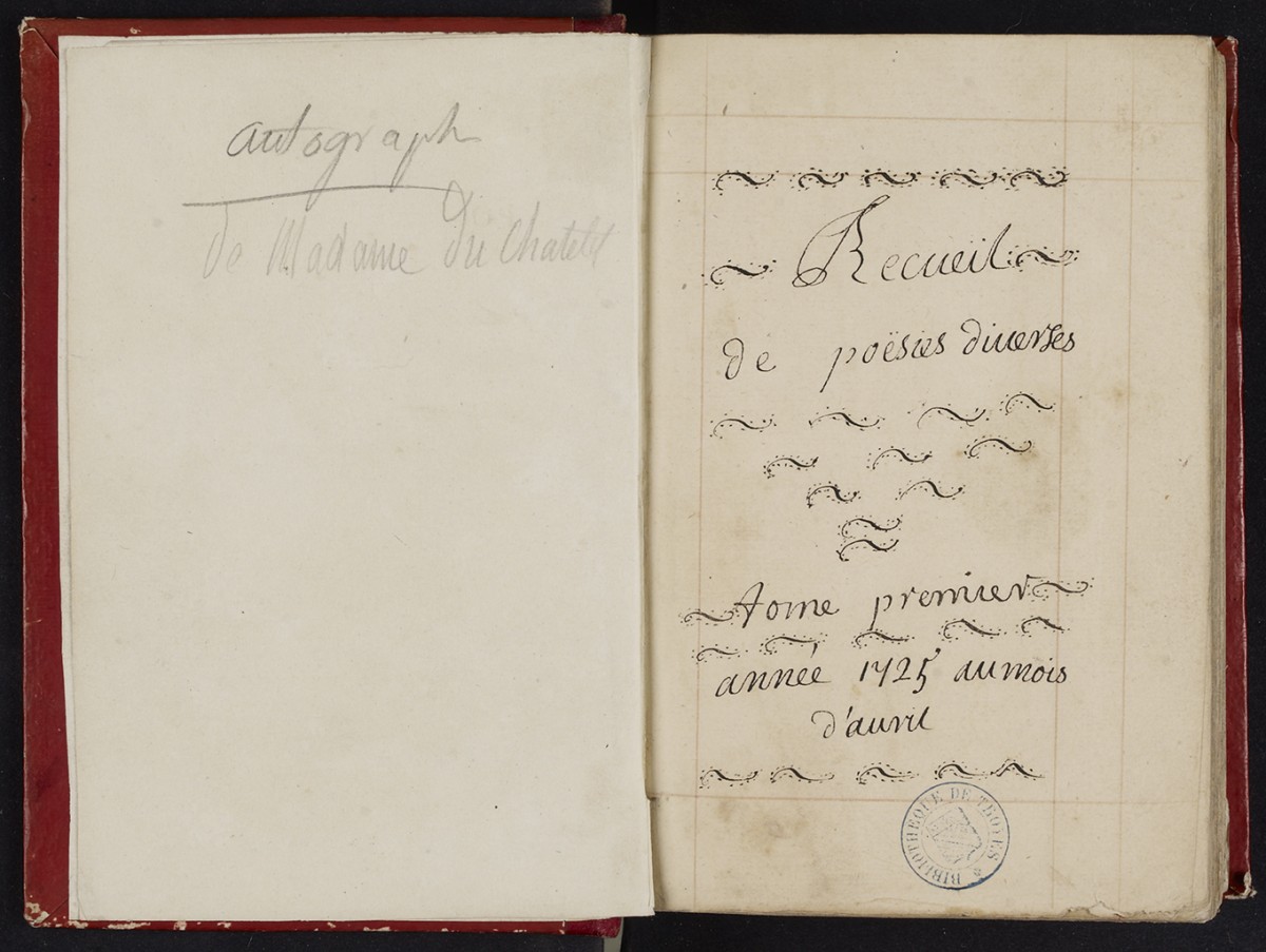 La Médiathèque conserve plusieurs manuscrits de Madame Du Châtelet, acquis par la Bibliothèque de Troyes au XIXe siècle, et prêtés pour cette exposition. Il s’agit d’un recueil de poésies, copiés de sa main en 1725 dans un volume de 700 pages (Manuscrit 2375). Ce sont aussi des copies anonymes de ses commentaires de la Bible (Manuscrits 2376 et 2377). La Médiathèque prête également un ouvrage imprimé en 1740, les Institutions de physique, où Emilie Du Châtelet présente les théories philosophiques et scientifiques de son époque.