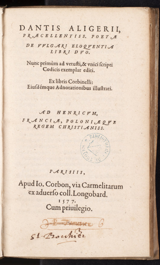 Le fonds ancien de la Médiathèque du Grand Troyes possède plusieurs de ces ouvrages, destinés à la cour de France, parmi lesquels La Coltivatione (1546) du poète Luigi Alamanni, la comédie Candelaio (1582) du philosophe napolitain Giordano Bruno, le De vulgari eloquentia (1577) de Dante, portant la marque de possession du poète mâconnais Pierre Tamisier, ainsi que les deux traités d’architecture de Sebastiano Serlio (1545 et 1547) .