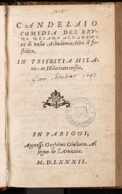 Candelaio, Comedia del Bruno Nolano achademico di nulla achademia. Giordano Bruno. 1582