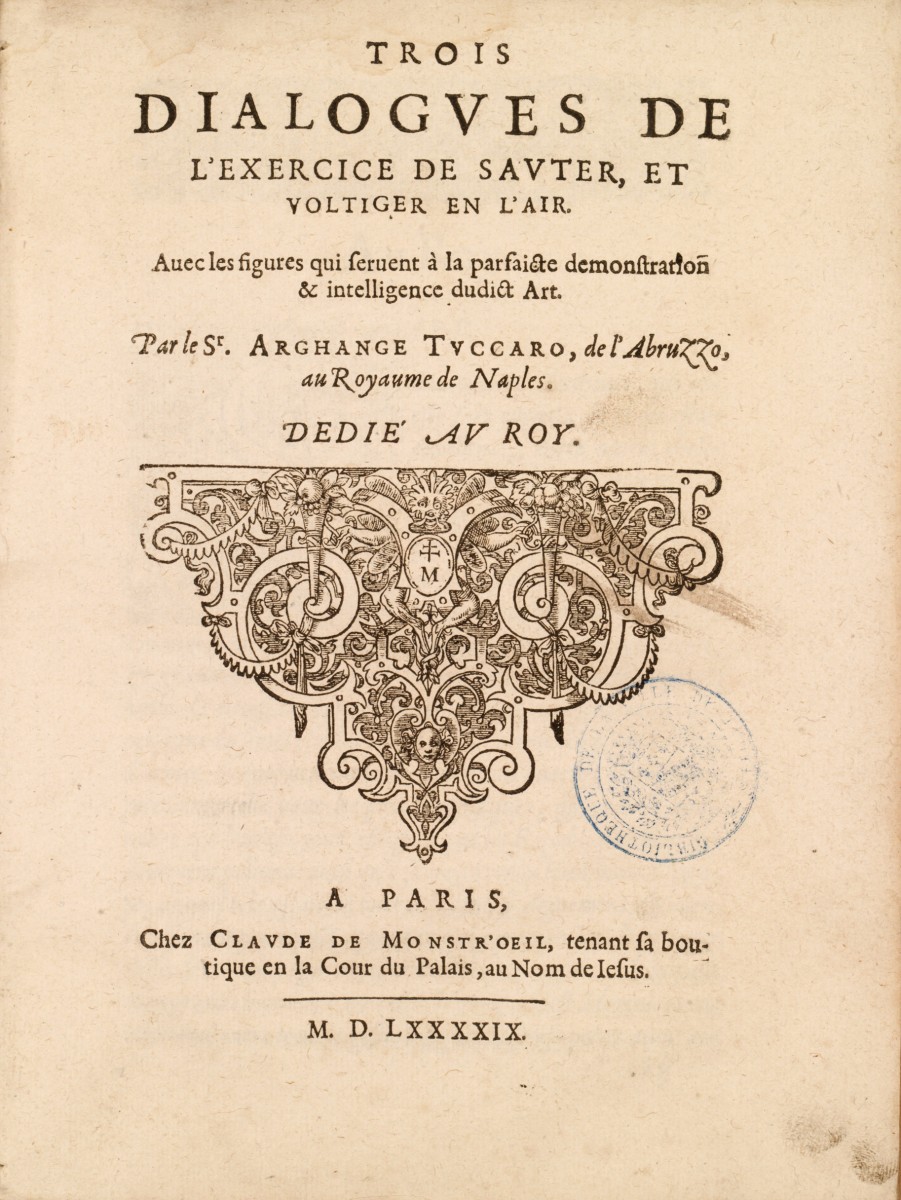 Trois dialogues de l’exercice de sauter et voltiger dans l’air. Archangelo Tuccaro. Paris, 1599. S-10-2378. Médiathèque du Grand Troyes. Photo E. Bord