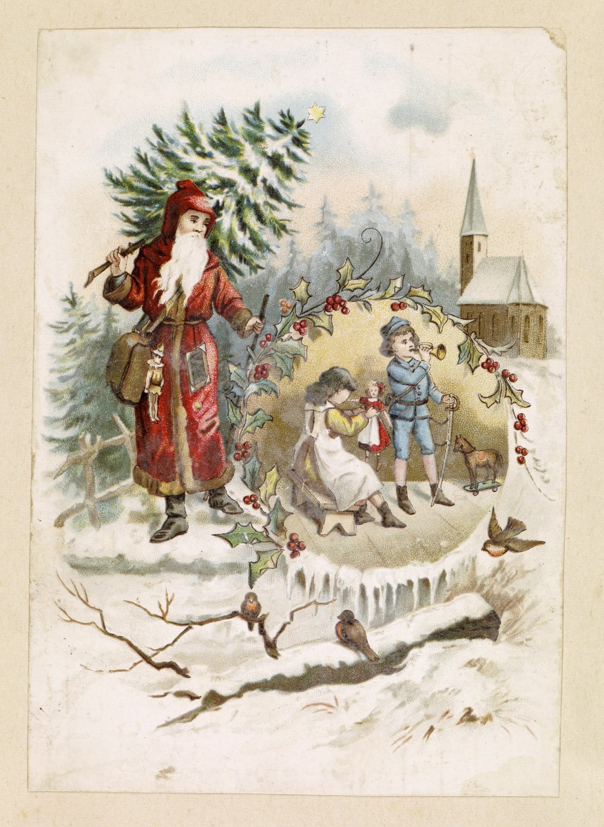 En Europe, la publication en 1843 d’ «Un Conte de Noël » de Charles Dickens contribue à fixer progressivement le passage de la célébration de la Saint-Nicolas à celle de Noël. Cette même année, la première carte de Noël est publiée au Royaume –Uni. Car c’est désormais l’évolution des techniques d’impression et l’apparition de la chromolithographie qui vont largement contribuer à la diffusion de cette nouvelle imagerie.