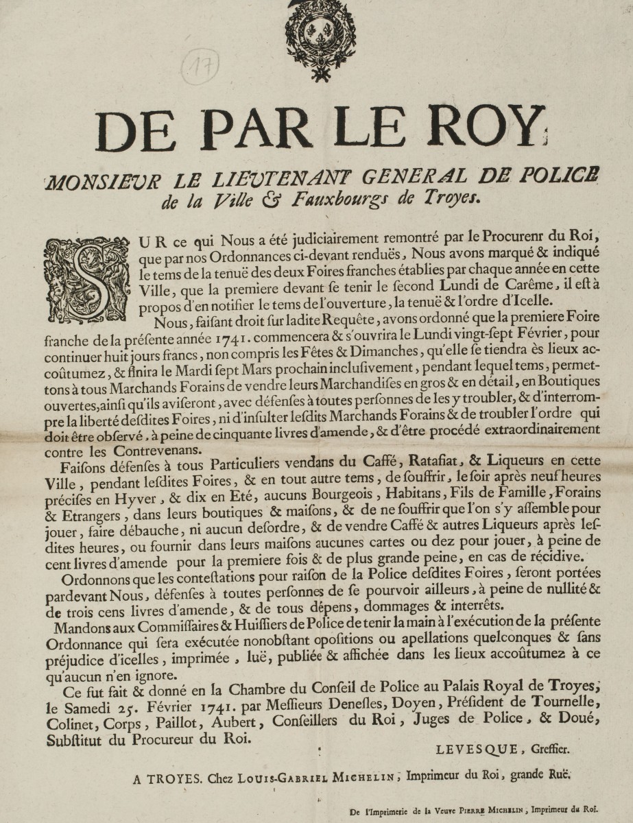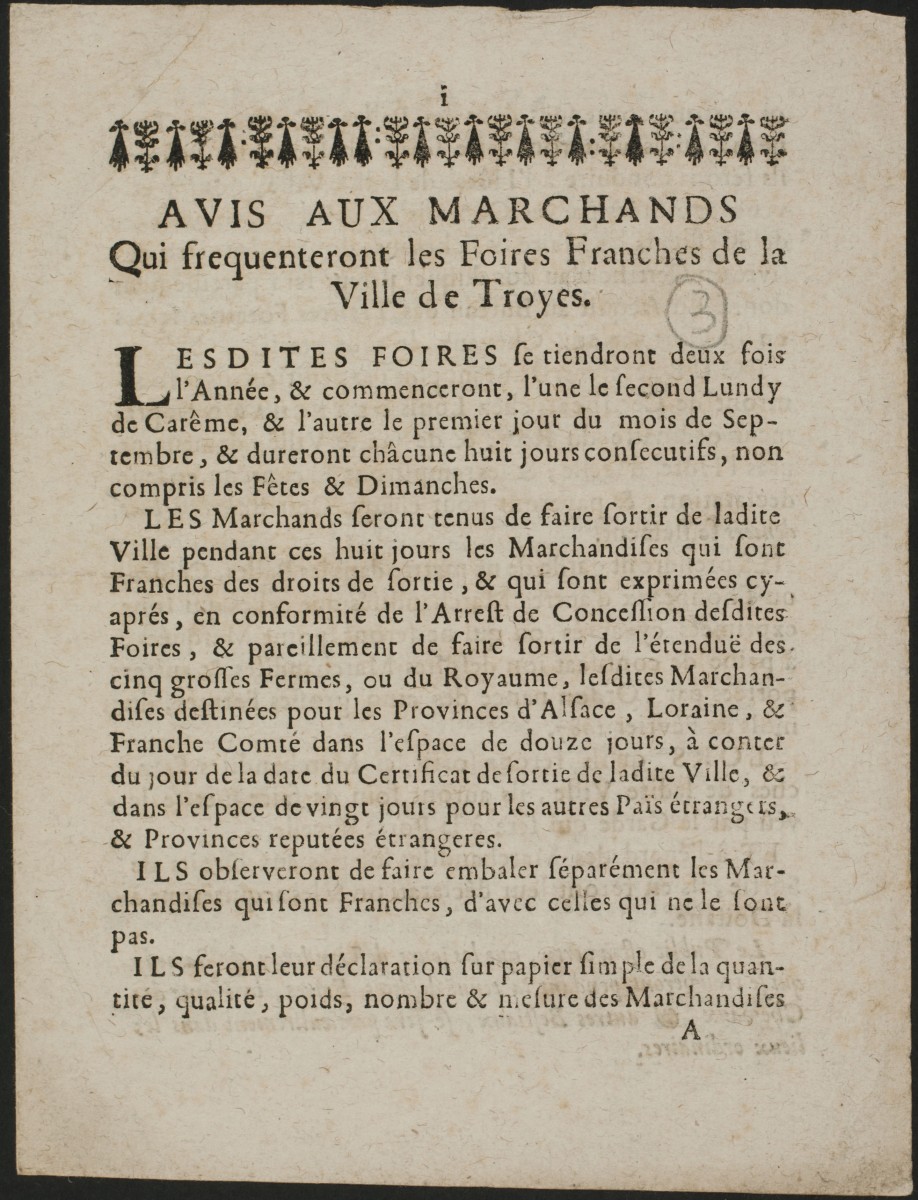 « Les habitants voyant enfin le commerce presque anéanti, et leur ville devenue si pauvre et tellement diminuée que de cinquante mille habitants qu’il y avoit autrefois, il ne s’en trouve pas plus de dix huit mille, […] supplièrent Louis XIV, l’an 1697, de vouloir rétablir en ladite ville de Troyes les foires dont ils jouissoient cy devant, afin de la relever de l’extrême décadence où elle étoit tombée. »