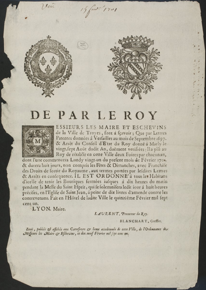 Les Mémoires historiques et chronologiques des Antiquités de la Ville de Troyes, rédigées au 18e siècle par Duhalle, nous racontent le rétablissement des foires par Louis XIV :