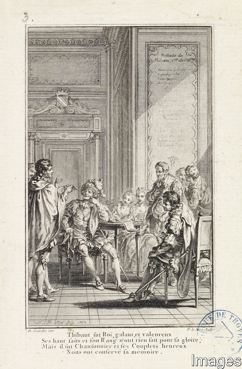 Parmi eux, on peut citer notamment le comte Thibault IV de Champagne, dit « le Chansonnier », connu pour ses faits d’armes autant que pour son goût pour les poètes et les chansons courtoises. Il domina la Champagne durant toute la première moitié du XIIIe siècle. A l’image de Lancelot, modèle du chevalier courtois, Thibault vit une passion secrète pour la reine Blanche de Castille, mariée au roi de France Louis VIII. Thibault composa 71 chants lyriques dont 37 chansons d’amour. En l’honneur de Blanche, il aurait fait peindre certains de ses poèmes sur les murs de son palais à Troyes, situé sur l’actuelle place du Préau et détruit à la Révolution.