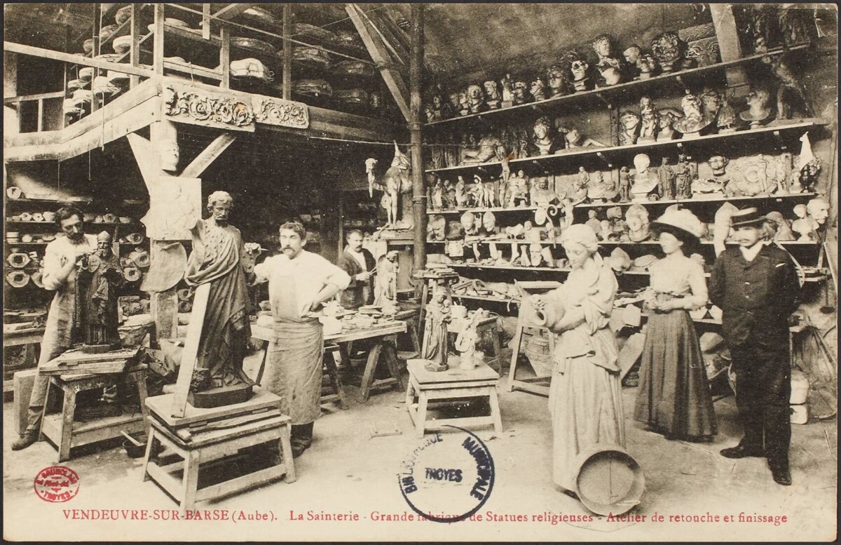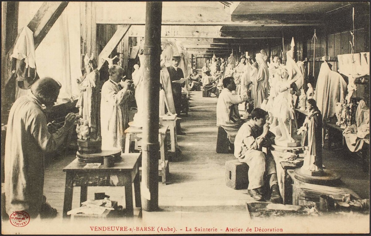 « Vers 1842, lorsqu’on quittait Vendeuvre pour aller en direction de Troyes, à gauche de la route, une grange attirait l’attention par sa position insolite au milieu des vignes. La curiosité conduisant sur les lieux, on remarquait des parties de coprs humains éparses dans tous les coins et recoins de cette grange, il y avait des têtes, des bras, des jambes, des mains modelées en terre ; quelques moules en plâtre et des livres sur les saints ajoutaient à ce spectacle hallucinant la note la plus incohérente. » Abbé J. Durand, Une Manufacture d’Art Chrétien, la « Sainterie » de Vendeuvre-sur-Barse, 1842-1961.