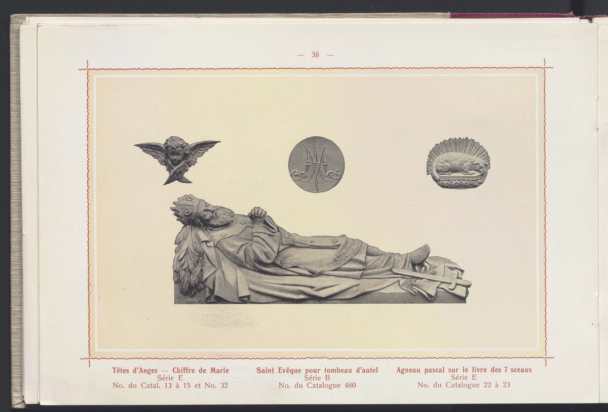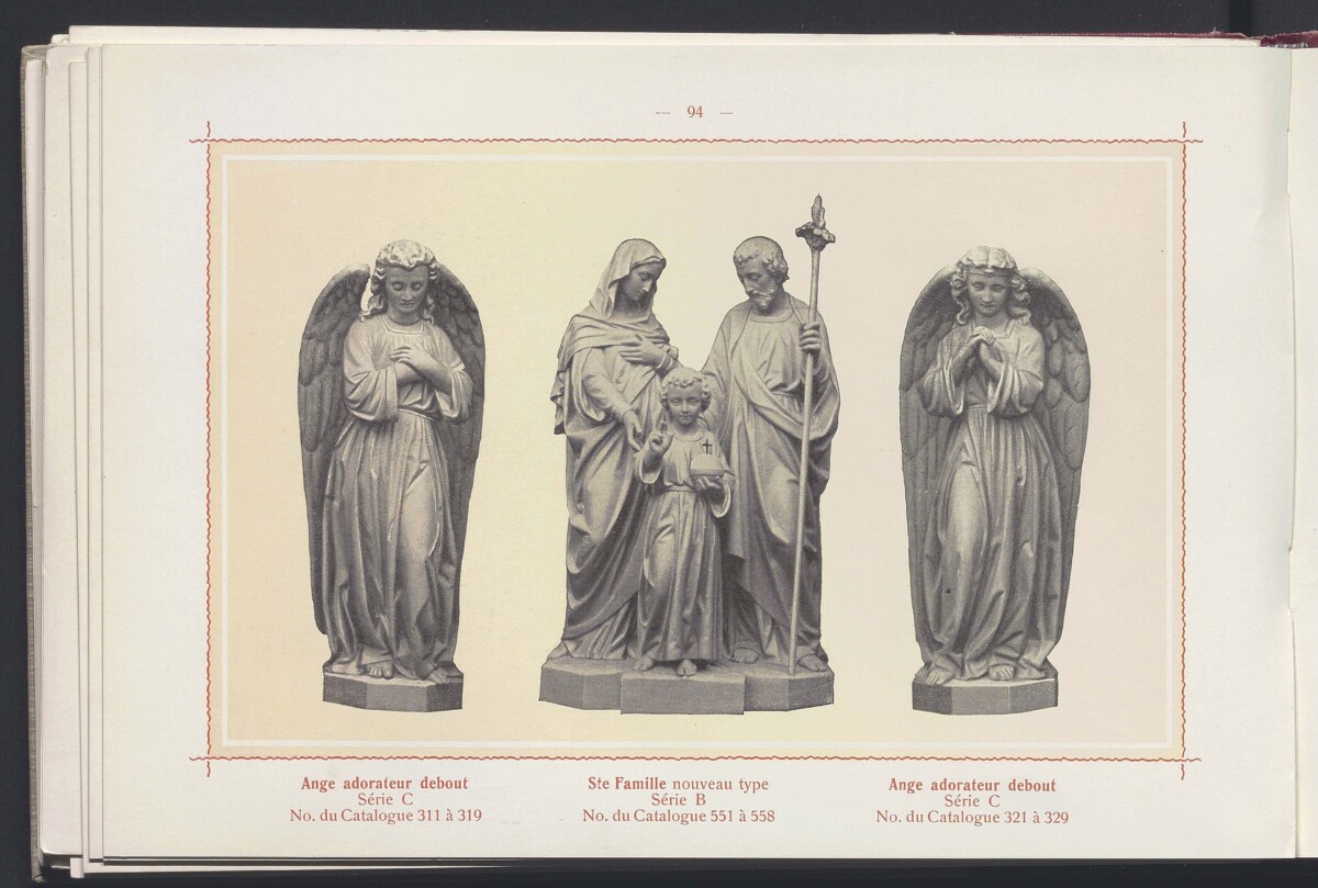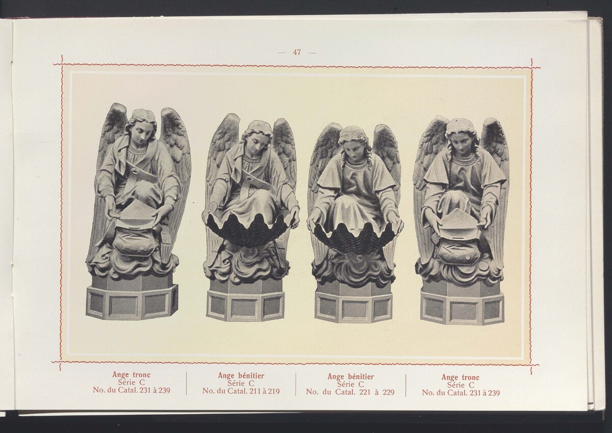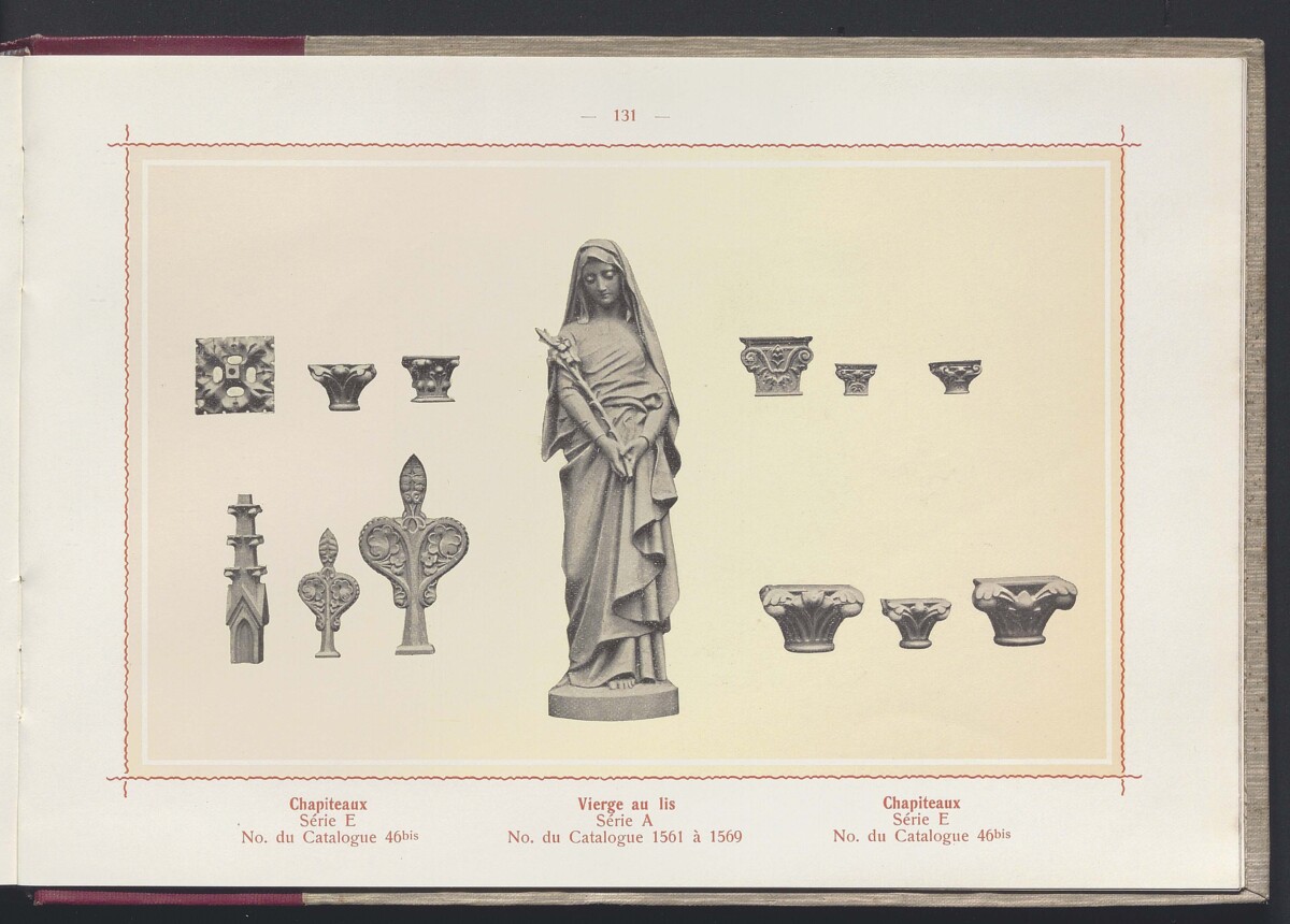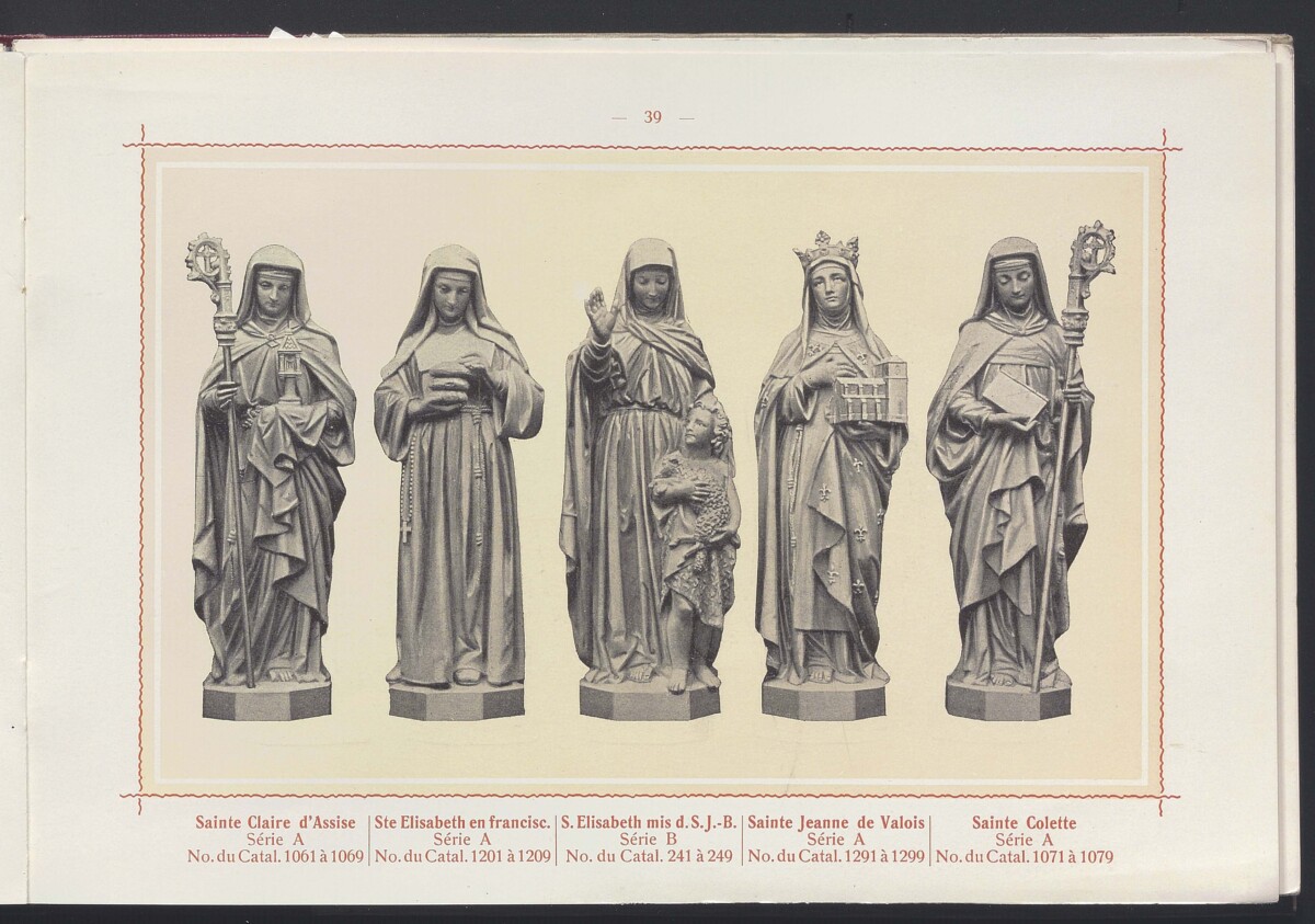 « Pour ce faire, à partir d’une sculpture originale, est confectionné un moule en plâtre destiné à en réaliser de multiples copies. Afin qu’il soit réutilisable, le moule se constitue de nombreuses pièces s’ajustant parfaitement entre elles et se calant dans une « chape » fermée par un couvercle. L’estampeur tapisse la surface intérieure du moule d’une couche d’argile puis assemble les deux parties de la chape au moyen d’une argile diluée en pressant fortement sur le couvercle. Le démoulage s’effectue quelques instants plus tard. […] Les statues étaient peintes et décorées ensuite. » Les saints de Vendeuvre dans la lumière : Exposition de statues de l’ancienne Manufacture d’Art Chrétien de Vendeuvre-sur-Barse. 15 juin-17 septembre 2023. Cathédrale Saint-Pierre et Saint-Paul de Troyes organisée par ArTho et la cathédrale de Troyes, F.L. 704.948 SAINT